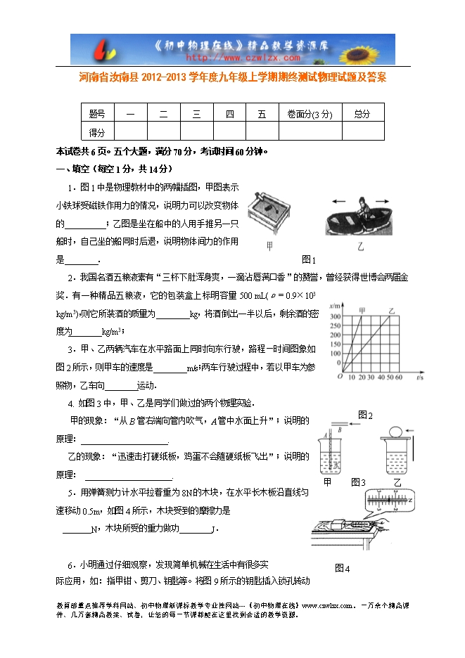 河南省汝南县2012-2013学年度九年级上学期期终测试物理试题及答案