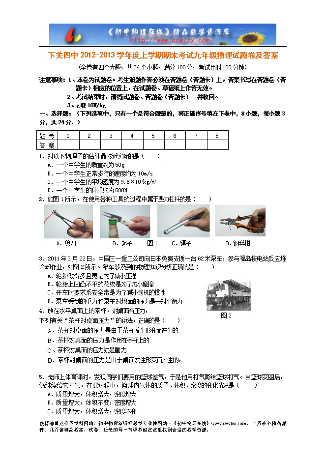 下关四中2012-2013学年度上学期期末考试九年级物理试题卷及答案