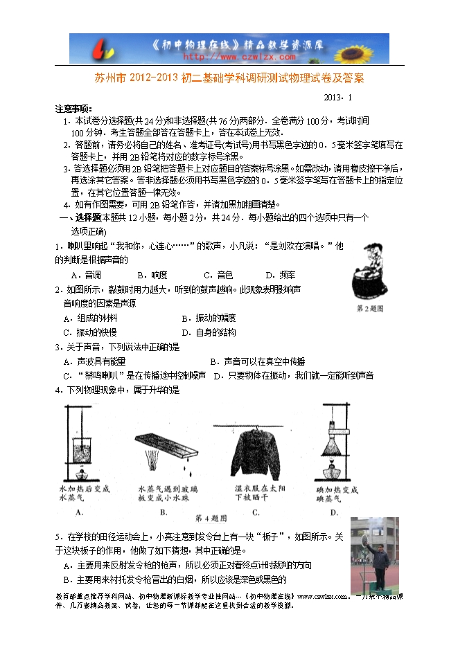 苏州市2012-2013初二基础学科调研测试物理试卷及答案