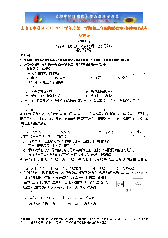 上海市奉贤区2012-2013学年度第一学期初三年级期终质量抽测物理试卷及答案