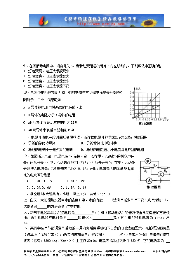 南京市联合体2012-2013学年度第一学期(末)学情分析九年级物理试题及答案