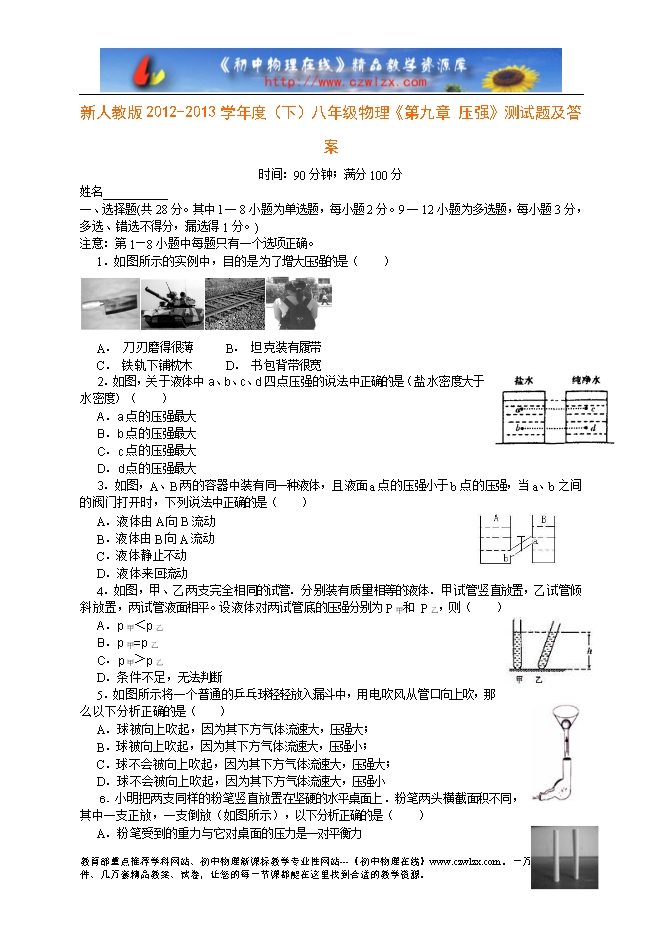 新人教版2012-2013学年度(下)八年级物理《第九章 压强》测试题及答案