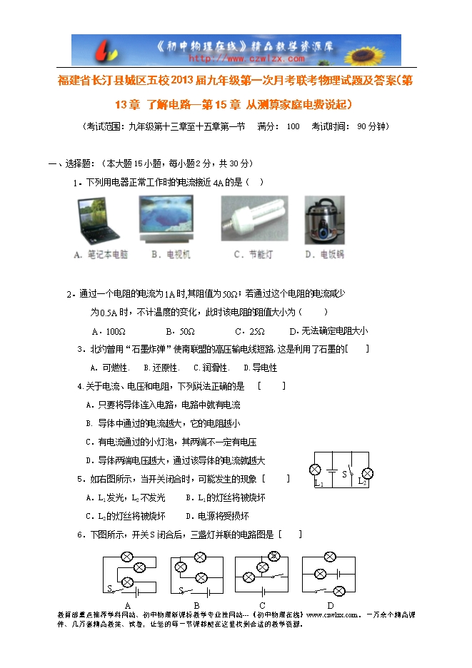 福建省长汀县城区五校2013届九年级第一次月考联考物理试题及答案(第13章 了解电路--第15章 从测算家庭电费说起)