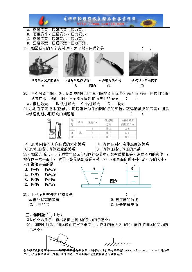 7.如图三所示,物体A在水平推力F的作用下,从甲图位置匀速运动到乙图位置. 在此过程中, A对桌面的压力将____________,A对桌面的压强将 __ (选填“变大”、“不 变” 、“变小”)