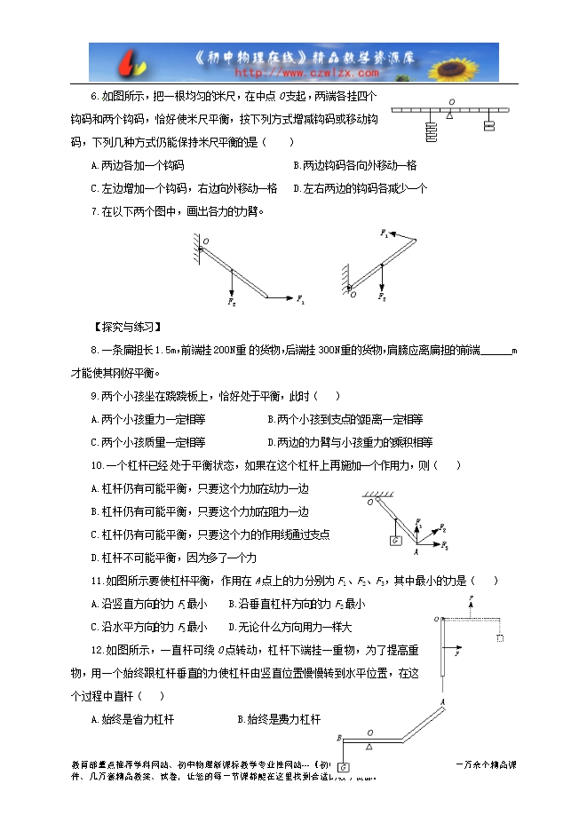 1.一根硬棒,在________________下能绕着___________转动,这根硬棒就是杠杆。支点是_________________________;动力是______________________;阻力是_______ _______________;动力臂:__________________________________________;阻力臂是_________________________________________。在日常生活中我们使用的工具属于杠杆的有__________、__________、___________等。