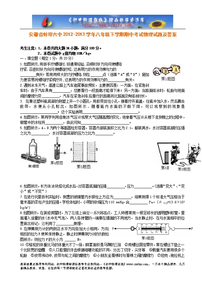 安徽省蚌埠六中2012-2013学年八年级下学期期中考试物理试题及答案