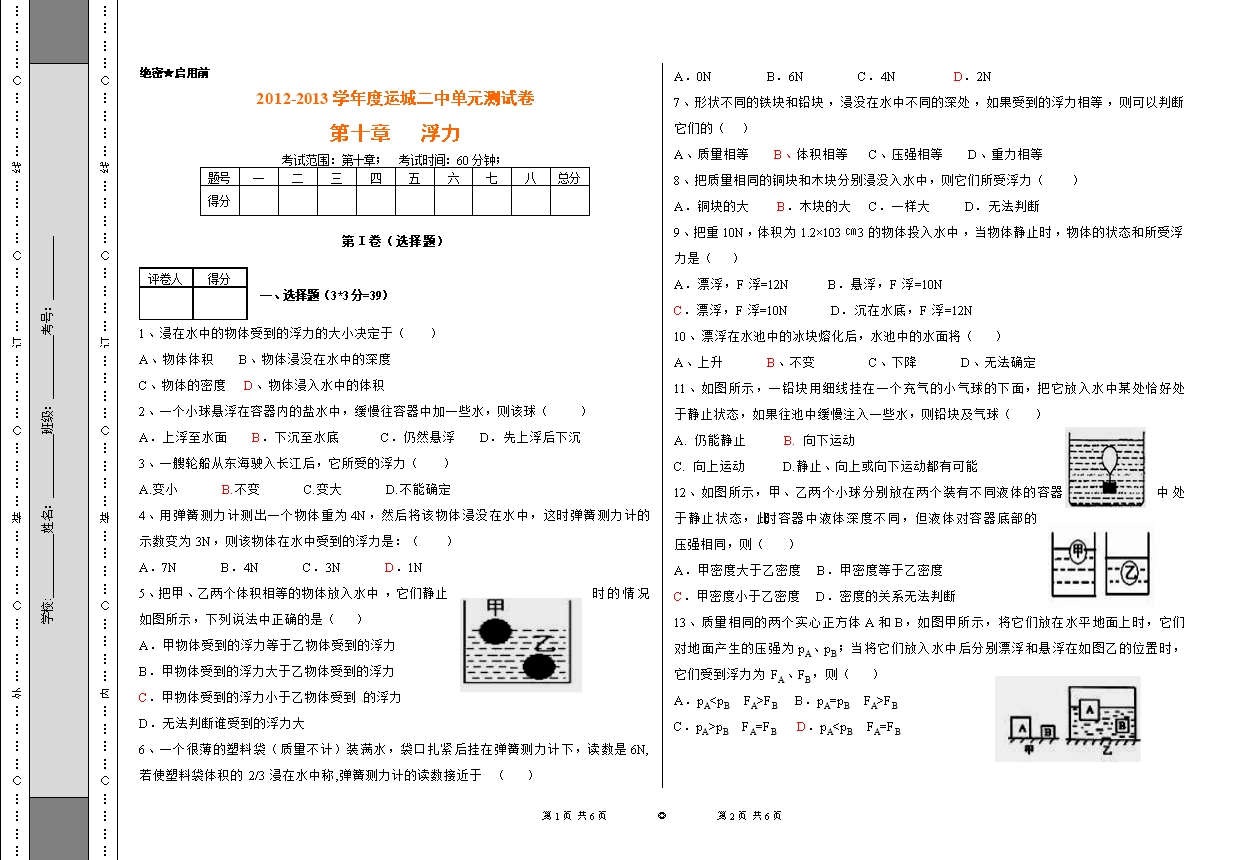 【内容简介】 第I卷(选择题) 一、选择题(3*3分=39) 1、浸在水中的物体受到的浮力的大小决定于( ) A、物体体积 B、物体浸没在水中的深度 C、物体的密度 D、物体浸入水中的体积 2、一个小球悬浮在容器内的盐水中,缓慢往容器中加一些水,则该球( ) A.上浮至水面 B.下沉至水底 C.仍然悬浮 D.先上浮后下沉 3、一艘轮船从东海驶入长江后,它所受的浮力( ) A.变小 B.不变 C.变大 D.不能确定 4、用弹簧测力计测出一个物体重为4N,然后将该物体浸没在水中,这时弹簧测力计的示数变为3N,则该物体在水中受到的浮力是:( ) A.7N    B.4N    C.3N    D.1N 5、把甲、乙两个体积相等的物体放入水中,它们静止时的情况如图所示,下列说法中正确的是( ) A.甲物体受到的浮力等于乙物体受到的浮力 B.甲物体受到的浮力大于乙物体受到的浮力 C.甲物体受到的浮力小于乙物体受到 的浮力 D.无法判断谁受到的浮力大 6、一个很薄的塑料袋(质量不计)装满水,袋口扎紧后挂在弹簧测力计下,读数是6N,若使塑料袋体积的2/3浸在水中称,弹簧测力计的读数接近于 ( ) ........ ? ? ?