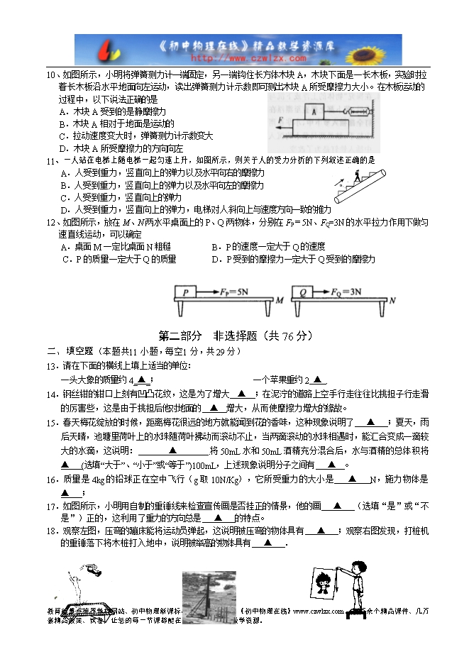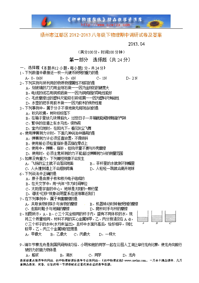 扬州市江都区2012-2013八年级下物理期中调研试卷及答案