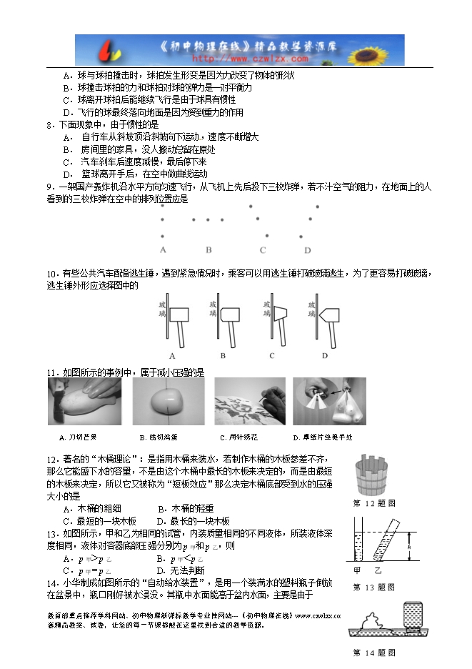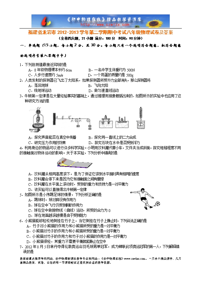 福建省龙岩市2012-2013学年第二学期期中考试八年级物理试卷及答案