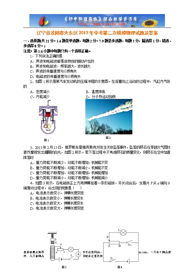 辽宁省沈阳市大东区2013年中考第二次模拟物理试题及答案