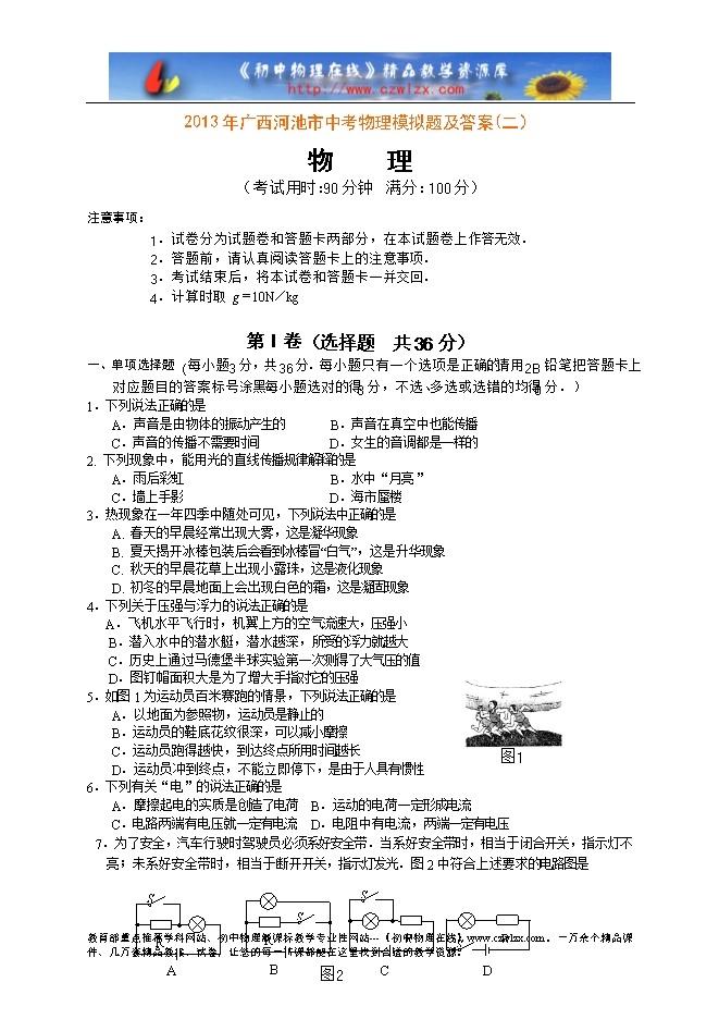 - 下一份试卷:2013年广西河池市中考物理模拟题及答案(三)