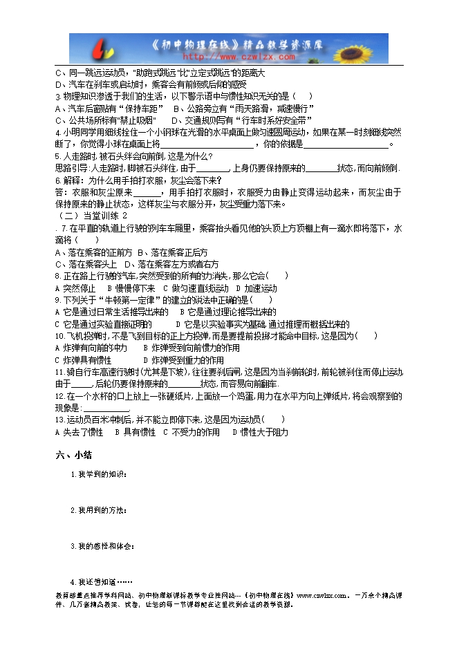 2、过程与方法:实验探究阻力对物体运动的影响;通过活动体验,一切物体都具有惯性。