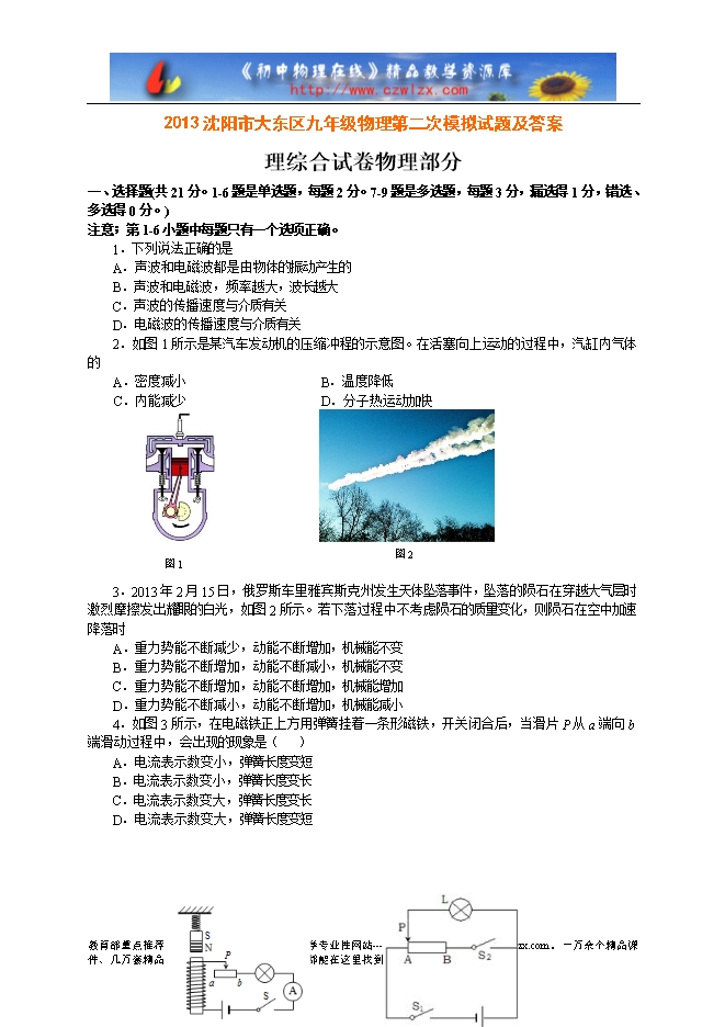 2013沈阳市大东区九年级物理第二次模拟试题及答案