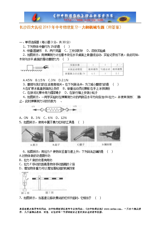长沙四大名校2013年中考物理复习--力和机械专题(附答案)