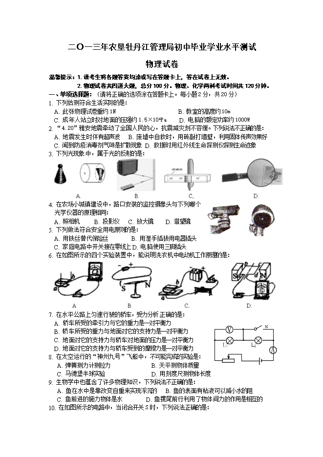 2013年农垦牡丹江管理局初中毕业学业水平测试物理试卷(word版有答案)