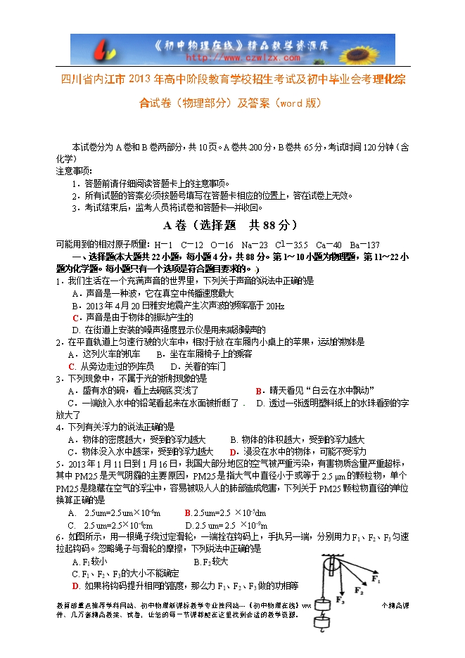 四川省内江市2013年高中阶段教育学校招生考试及初中毕业会考理化综合试卷(物理部分)及答案(word版)