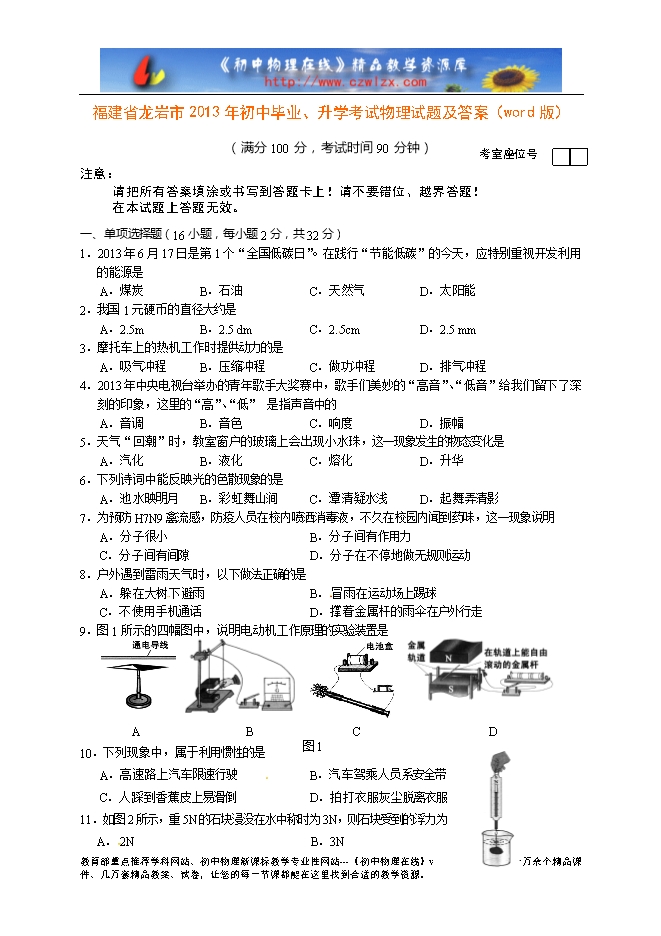 福建省龙岩市2013年初中毕业、升学考试物理试题及答案(word版)