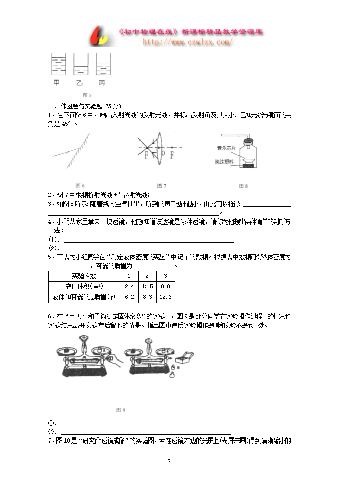 【内容简介】................ 8、我们在这学期学习了很多新材料,这些新材料在很大程度上改变了我们的生活,请举出两个 你所知道的新材料: (1)_________________________________________________________ (2)_________________________________________________________ 四、问答、设计与计算题(25分) l、小李在家看电视时,不小心将水弄在了电视机的荧光屏上,他赶忙去拿抹布擦,就在他准备擦时,他通过了水滴看到了三种不同的颜色,请你说出是哪三种? 2、一个阳光灿烂的下午,一些同学到山区游玩时,当池们来到一个大岩洞口时,很多同学都提议停下来看一看,不过有一个问题他们得先解决,那就是当时他们谁都没带手电筒,里面光线很暗,机灵的小明看见了很多同学随身携带的带有镜子的小书包,立即有了主意,聪明的你知道了吗? 3、小明的自行车坏了,他把自行车送到修车铺去给师傅修,在师傅修的时候,他偶尔看见了师傅在给自行车的小钢珠上油,爱动脑的他提出了疑问“这个小钢珠是钢做的吗?”请你设计一种鉴别方法来探究这一问题。 (1)写出所需的实验器材; (2)要写出相应的实验步骤。(要求用字母表示所测的物理量) .............. ?