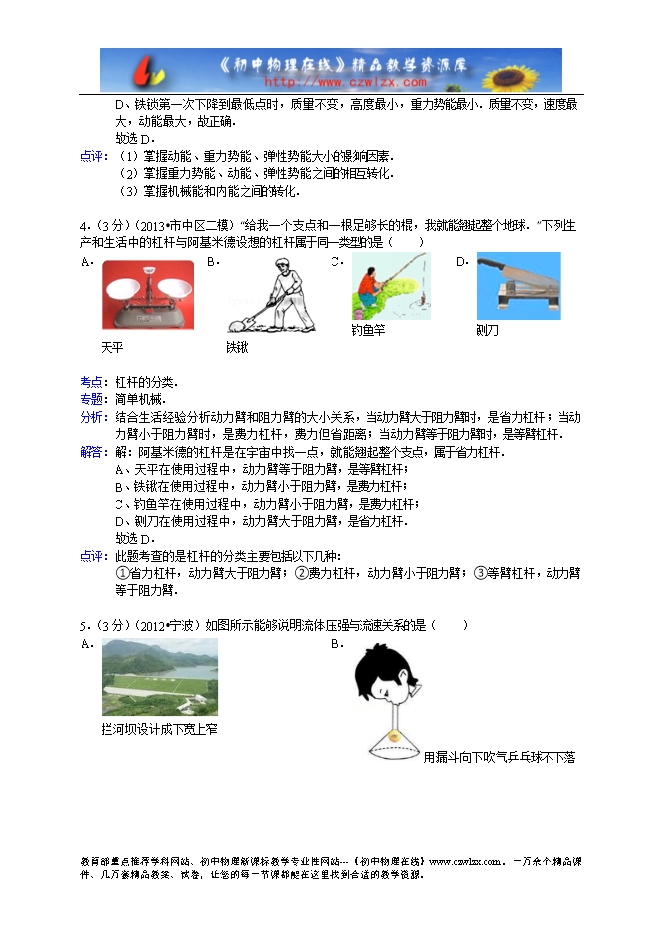 【内容简介】一、选择题(每小题只有一个选项符合题意,每题3分,共27分) 1.(3分)下列说法中正确的是(  )   A. 手拿1个鸡蛋的力大约0.5N   B. 一名中学生游泳时所受浮力约为50N   C. 中学生站立时对地面压强约为500Pa   D. 大气对我们手掌的压力约为50N 考点: 重力大小的估测;压力及重力与压力的区别;压强;浮力大小的计算. 专题: 估算综合应用题. 分析: 不同物理量的估算,有的需要凭借生活经验,有的需要简单的计算,有的要进行单位的换算,最后判断最符合实际的是哪一个. 解答: 解: A、一个鸡蛋的质量在50g=0.05kg左右,手拿一个鸡蛋的力大约为0.05kg×10N/kg=0.5N.此选项符合实际; B、中学生的体重在500N左右,游泳时接近漂浮状态,浮力等于重力,接近500N.此选项不符合实际; C、中学生的体重在500N左右,站立时双脚与地面的接触面积大约500cm2=0.05m2,对水平地面的压强为p= = =104Pa.此选项不符合实际; D、大气压约1.0×105Pa,一只手掌的面积在200cm2=0.02m2左右,受到的大气压力大约为F=pS=1.0×105Pa×0.02m2=2000N.此选项不符合实际. 故选A. 点评: 物理学中,对各种物理量的估算能力,是我们应该加强锻炼的重要能力之一,这种能力的提高,对我们的生活同样具有很大的现实意义.   2.(3分)(2013?宜昌)如图所示的事例中,属于增大压强的是(  ) ........ ? ?