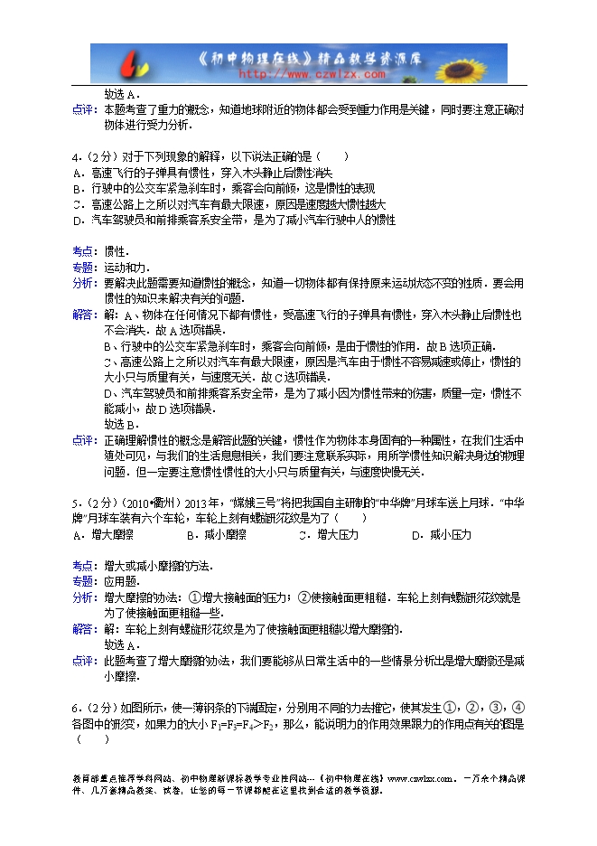3.(2分)小明上体育课训练投掷铅球,他用力将铅球投掷出去后,若不计空气阻力,铅球在飞行过程中受到的力有( )