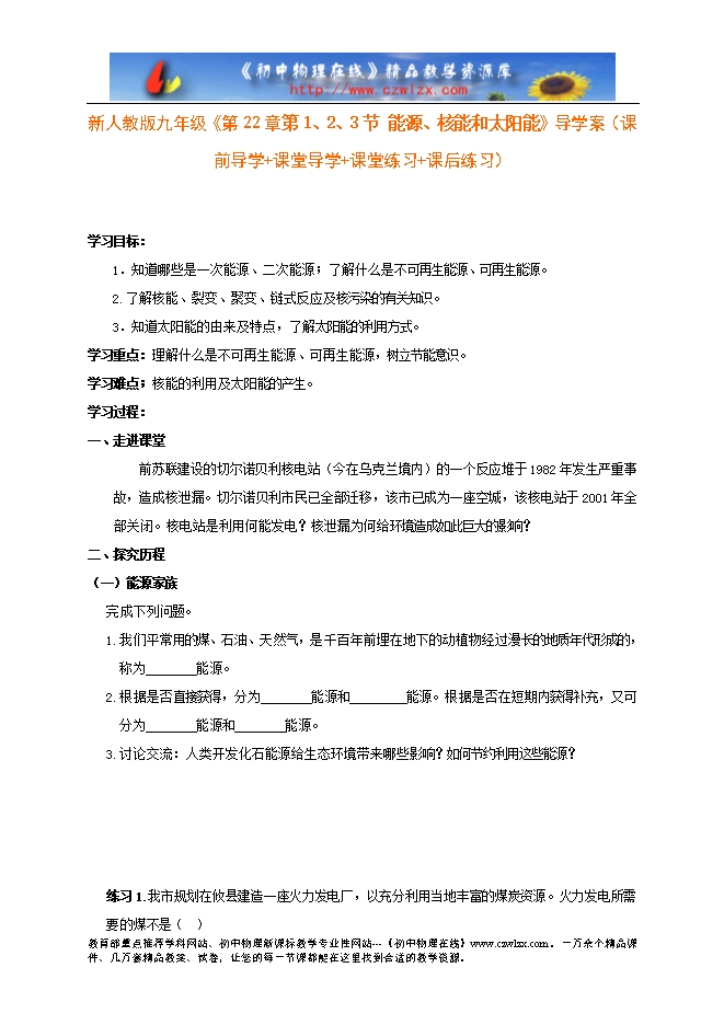 新人教版九年级《第22章第1、2、3节 能源、核能和太阳能》导学案(课前导学+课堂导学+课堂练习+课后练习)