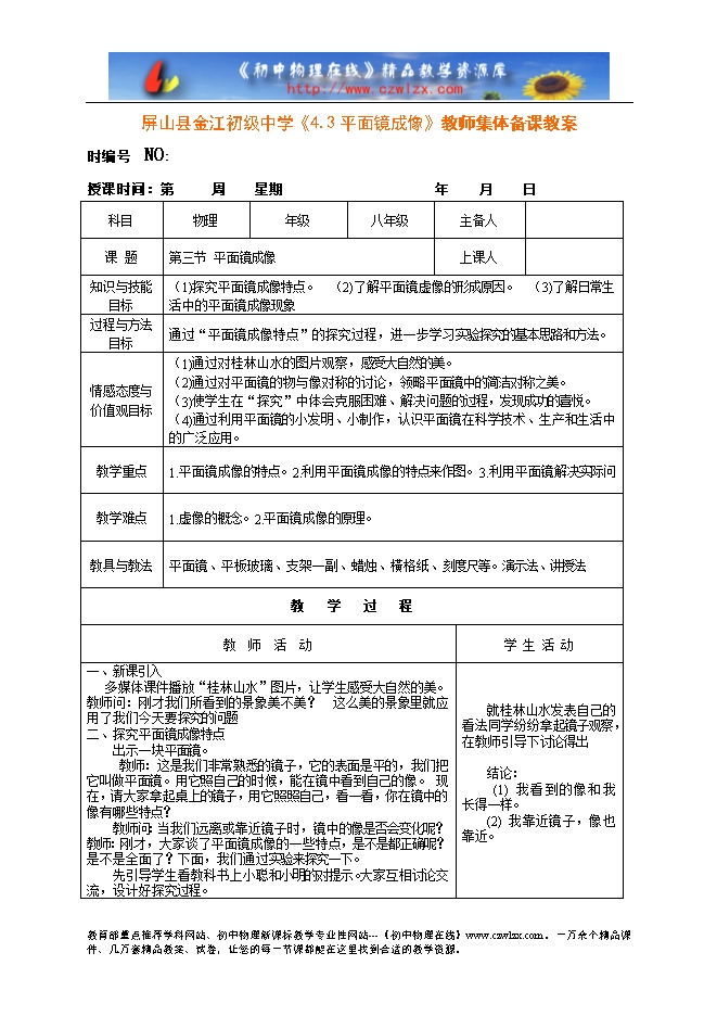 屏山县金江初级中学《4.3平面镜成像》教师集体备课教案