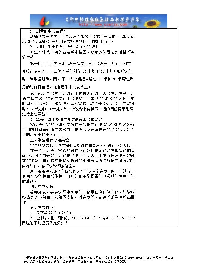 本节内容是初中学生的第一次实验课而且又是在操场上进行,所以教师必须向学生交代清楚物理实验课的特点和实验纪律,使学生知道物理实验课并不是娱乐课,也不是劳动课,更不是体育课。它是把理论知识和动手实验相结合并不断进行思维的动眼、动手、动脑等全面性地接受知识的过程,也是使学生直接获得知识和理解掌握运用知识的主要途径。而听懂实验过程,明确实验目的,正确操作仪器,注意实验纪律又是上好实验课的根本保证。因此实验前应让学生知道以下注意事项。