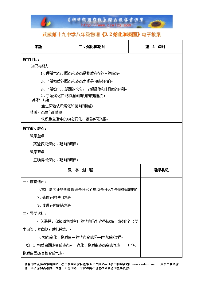 武威第十九中学八年级物理《3.2熔化和凝固》电子教案