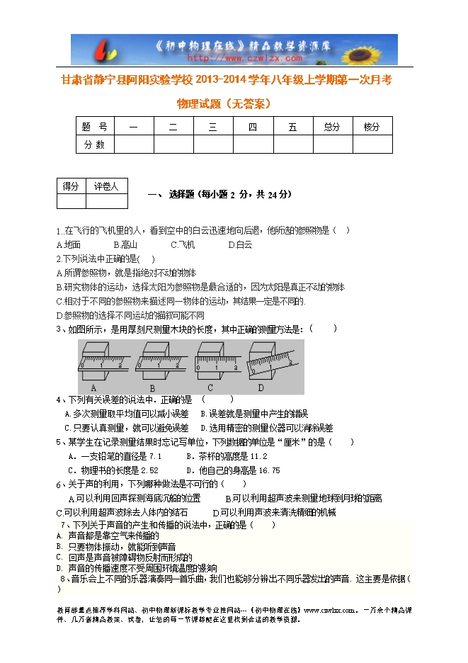 甘肃省静宁县阿阳实验学校2013-2014学年八年级上学期第一次月考物理试题(无答案)
