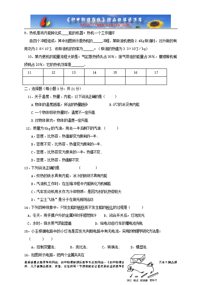 - 1133湖南省南县浪拔湖镇中学2014届九年级上学期第一次月考物理试题(无答案)
