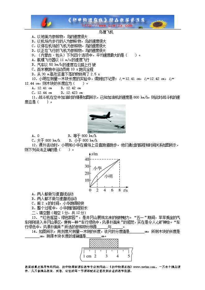 《初中同步测控全优设计》2013-2014沪科版八年级上册单元检测:第二章 运动的世界(含答案点拨)