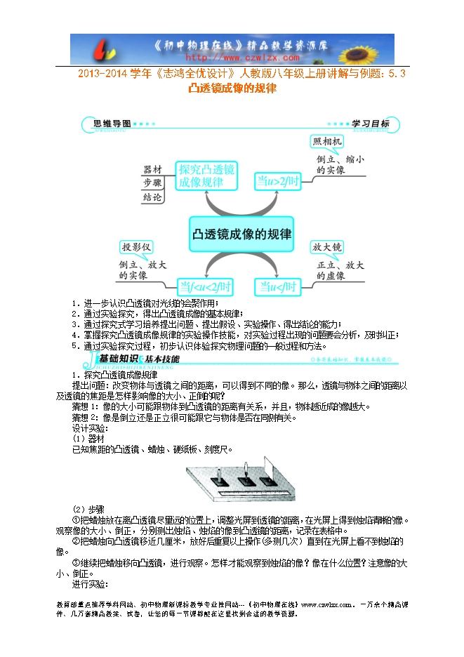 2013-2014学年《志鸿全优设计》人教版八年级上册讲解与例题:5.3凸透镜成像的规律