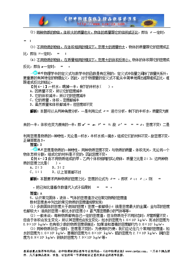 (1)同种物质组成的物体,其质量与它的体积成正比,且比值是一定的;