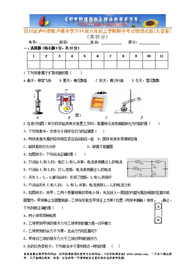 四川省泸州市毗卢镇中学2014届九年级上学期期中考试物理试题(无答案)