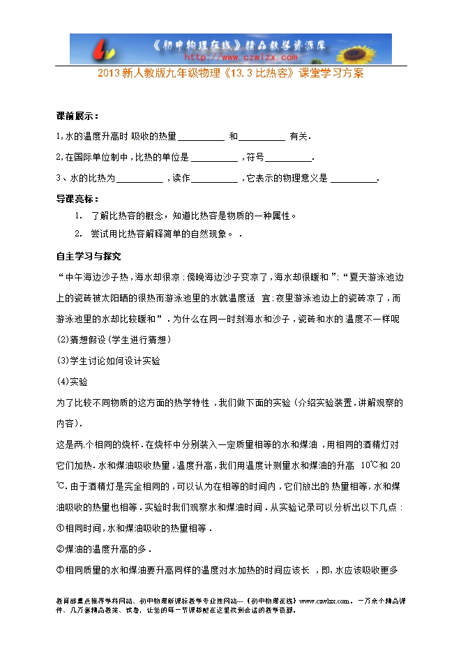 2013新人教版九年级物理《13.3比热容》课堂学习方案