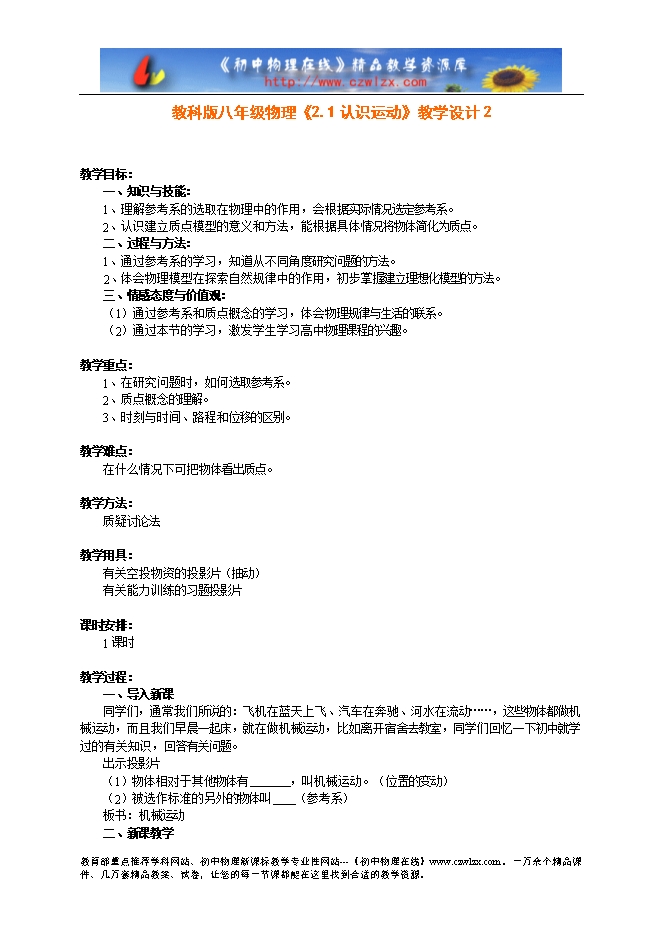 - 下一份资料:教科版八年级物理《2.2运动的描述》教学设计2
