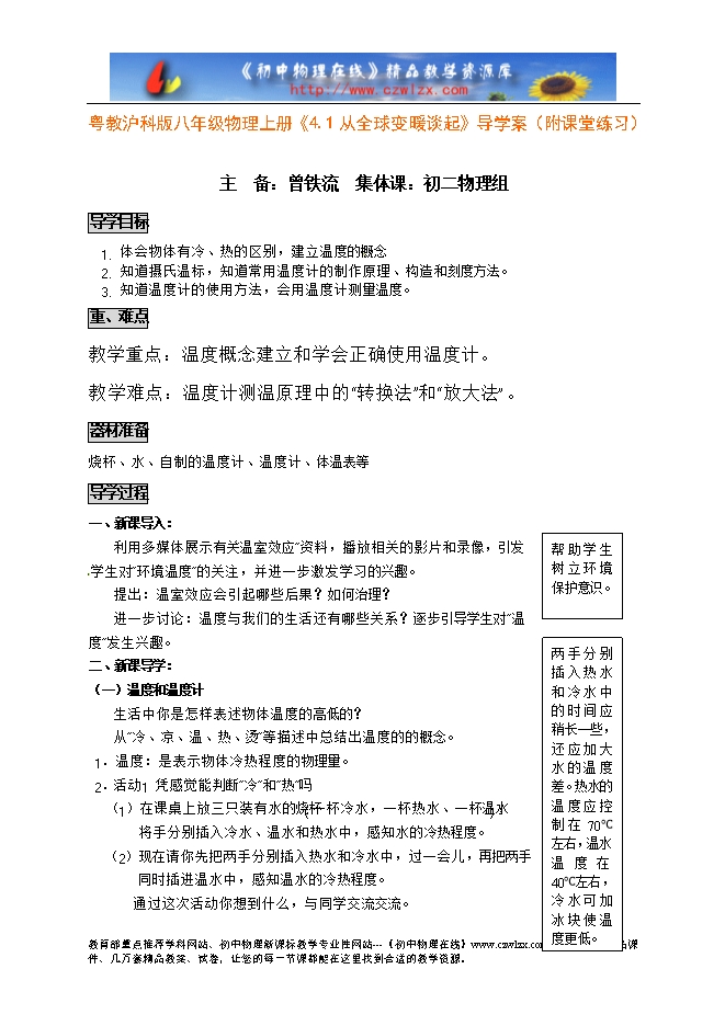 教学难点:温度计测温原理中的“转换法”和“放大法”。