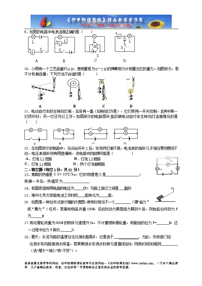 江苏省扬州市江都区花荡中学2014届九年级上学期期中考试物理试题及答案
