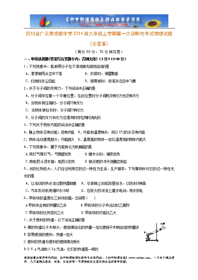 四川省广元市虎跳中学2014届九年级上学期第一次诊断性考试物理试题(无答案)
