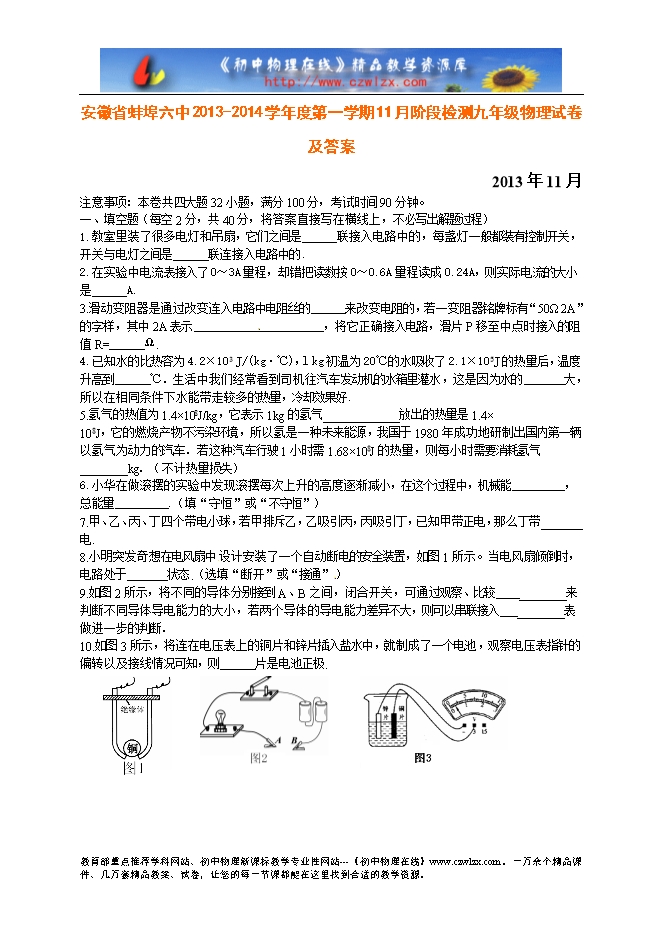 安徽省蚌埠六中2013-2014学年度第一学期11月阶段检测九年级物理试卷及答案
