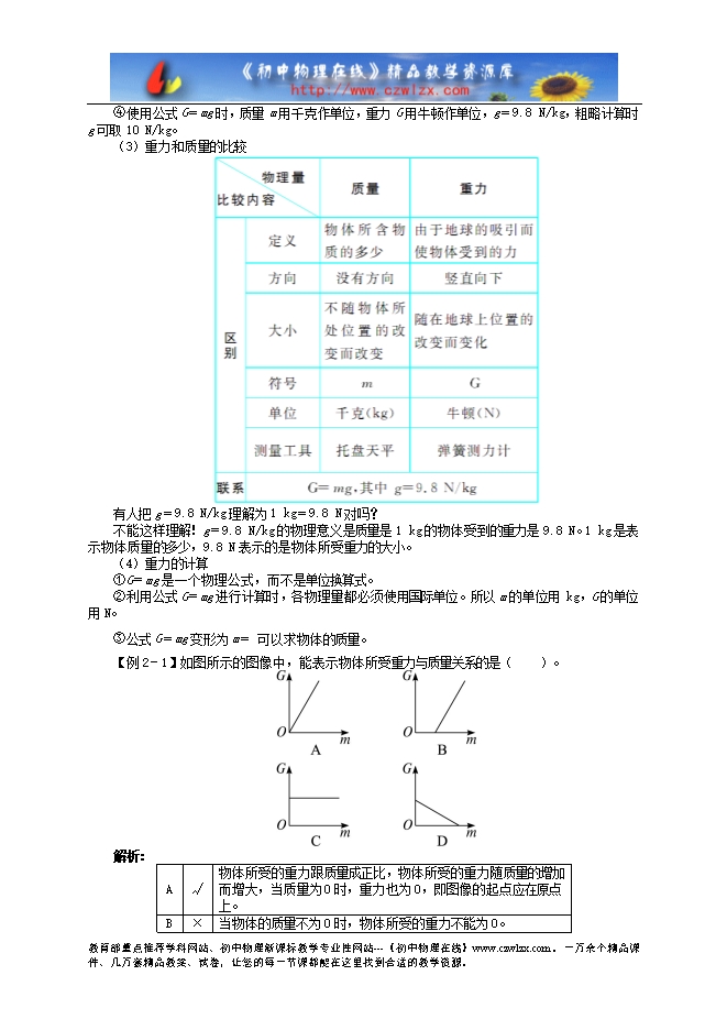 ②如果用G表示物体受到的重力,m表示物体的质量,g表示一个物体的物重跟这个物体的质量之比,则重力跟质量的关系可以写作: