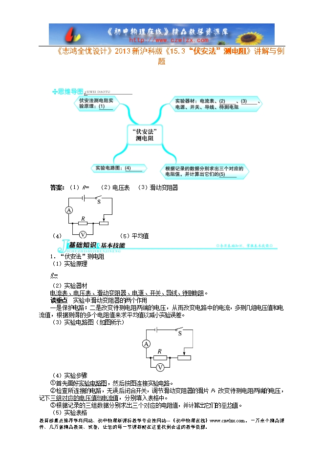《志鸿全优设计》2013新沪科版《15.3“伏安法”测电阻》讲解与例题