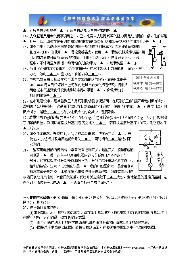 江苏省苏州市相城区2014届九年级上学期期中考试物理试题及答案