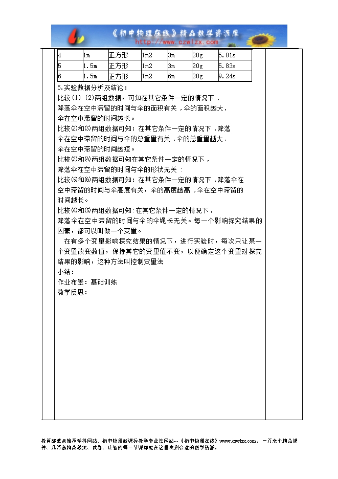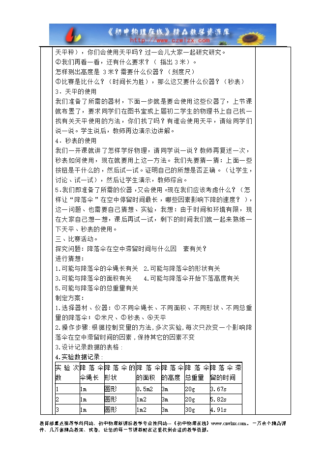2012新教科版八年级物理《1.3活动:降落伞比赛》教学设计