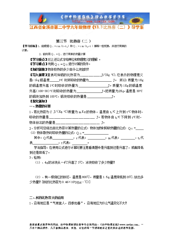 江西省金溪县第二中学九年级物理《13.3比热容(二)》导学案
