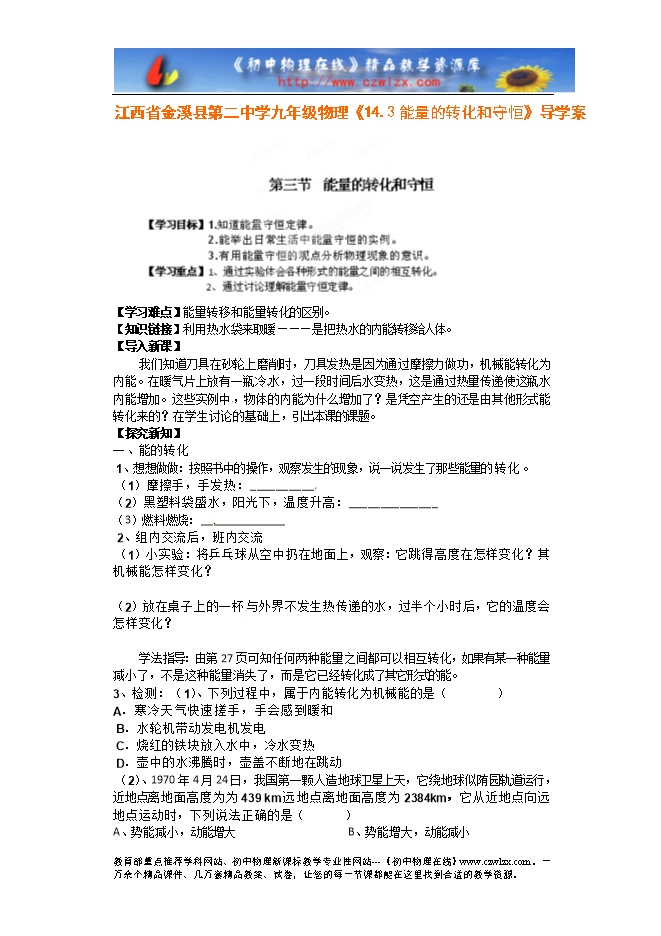 江西省金溪县第二中学九年级物理《14.3能量的转化和守恒》导学案