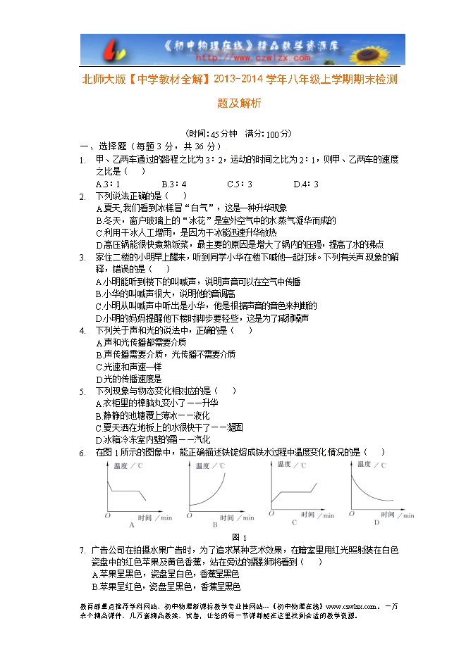 1. 甲、乙两车通过的路程之比为,运动的时间之比为,则甲、乙两车的速 度之比是( )