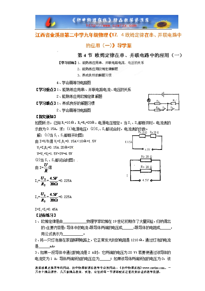 江西省金溪县第二中学九年级物理《17.4欧姆定律在串、并联电路中的应用(一)》导学案