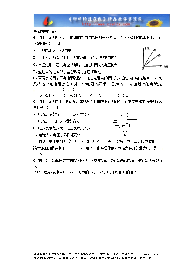 3、如果一段导体中通过的电流是2 A时,它两端的电压为20 V;若要使通过该导体的电流变为1 A,导体两端所加的电压应为______;如果该导体两端所加的电压为0,该导体的电阻值为______。