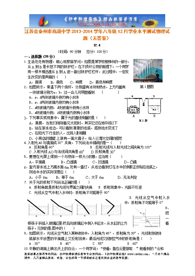 江苏省泰州市高港中学2013-2014学年八年级12月学业水平测试物理试题(无答案)